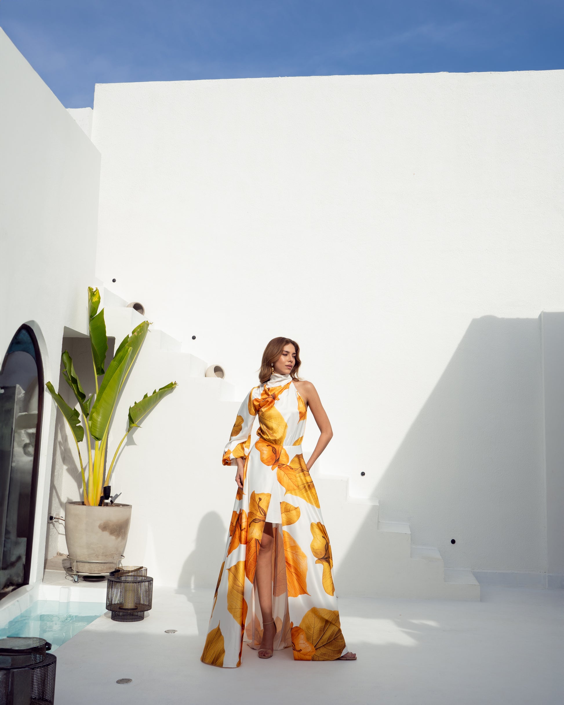 VESTIDO ASIMETRICO ESCOTE ALTO MAXI FALDA FLUIDA