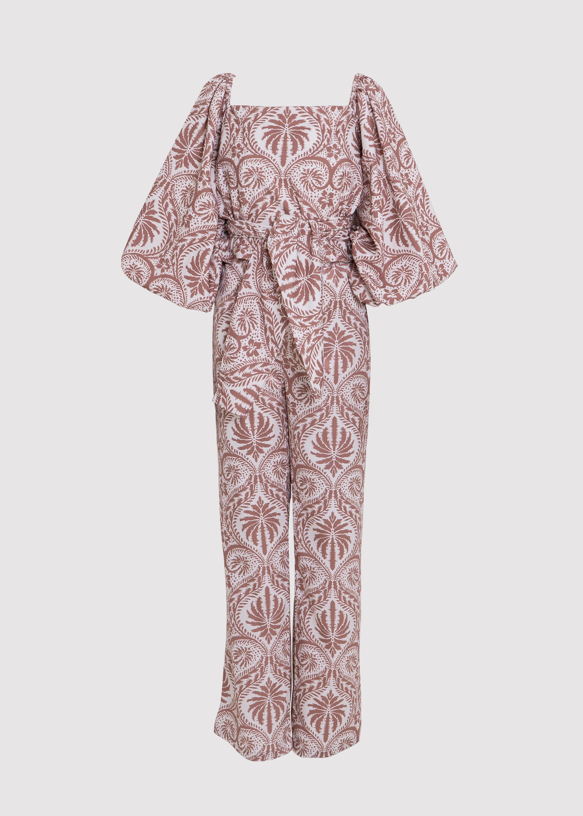 PANTALON CORTE RECTO - BLUSA DOBLE ESCOTE MANGA PUFFY - PRINT IKAT MOCCA